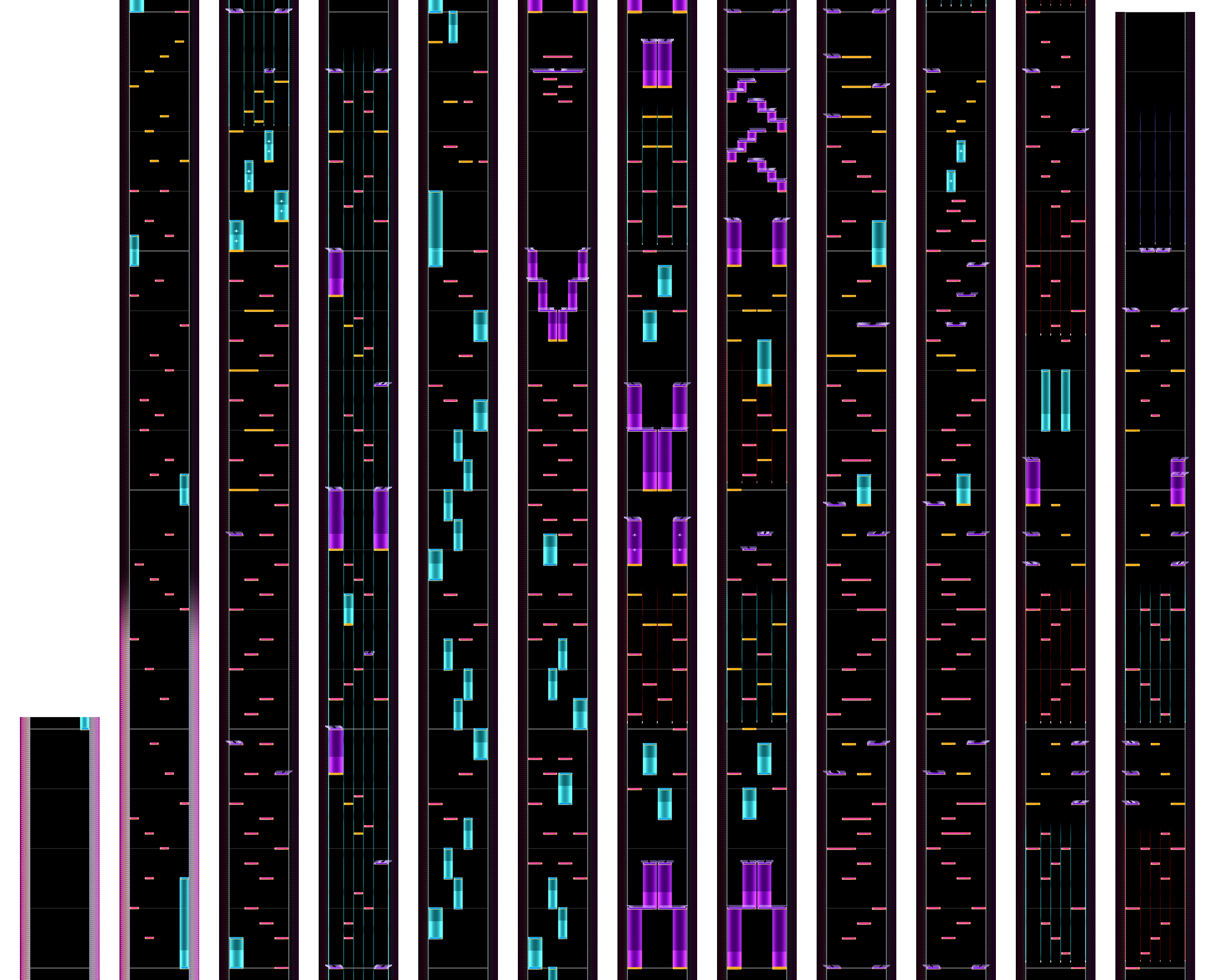 片手が独立している配置が多く、4k螺旋階段やトリルを捌かせながらメロディー合わせの16分ノーツを叩く等、要求される難易度は高い。